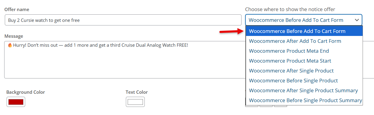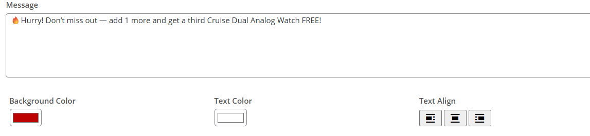 • Message: Write the offer text, e.g., “🔥Hurry! Don’t miss out — add 1 more and get a third Cruise Dual Analog Watch FREE!
