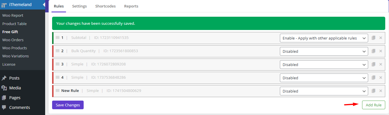 From your WordPress Dashboard, navigate to the Free Gift menu and open the Rules tab.
